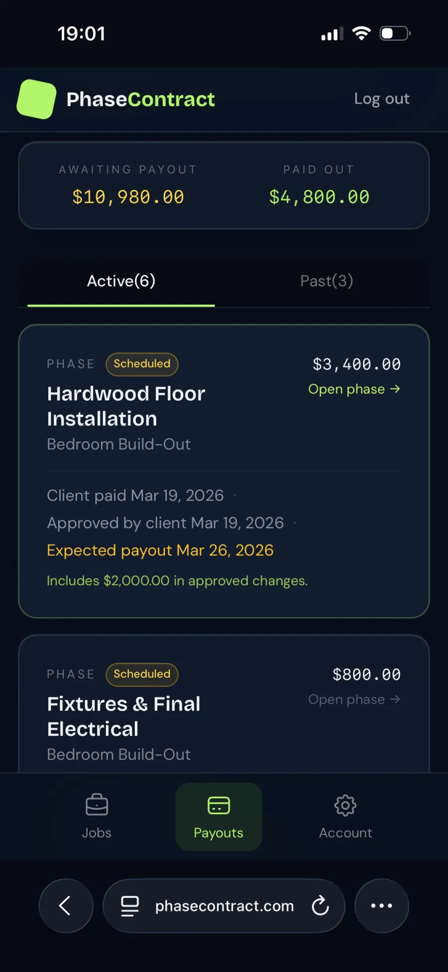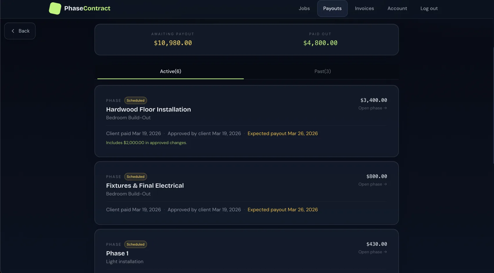 Real payouts — client-approved phases with expected payout dates